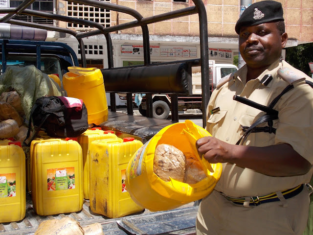 Kamanda wa polisi Tanga, Mihayo Msikhella, akiwaonyesha waandishi wa habari mbinu mpya za wasafirishaji mihadarati aina ya mirungi katika madumu ya maji ili kuficha ushahidi. Madumu hayo ambayo yamekamatwa yakiwa yamesheheni miringi ilikamatwa kijiji cha Chongoleani Wilayani Mkinga juzi.