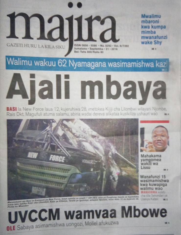 Magazeti yanaletwa kwenu kwa hisani kubwa na Kampuni ya Usafirishaji abiria ya Freys Coach inayofanya safari Tanga, Moshi, Arusha, Babati hadi Singida kila siku. Pia hufanya safari hiyo kuanzia Singida kila siku, Kwa Tanga Ofisi zake zipo Tanga mjini barabara ya 12 Ngamiani, simu 0622 292990